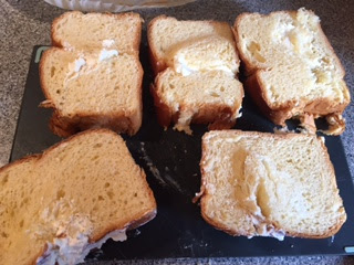 Cut the brioche loaf into thick slices and use a sharp knife to make a pocket in each slice as best you can. Fill with some cream cheese.