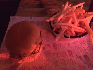 But I’m not a vegetarian and by the end of my long day at work I was ready for a burger. The Islington outpost is set back from Upper Street in an old garage; you have to walk down a small alley to get there which starts to build the atmosphere. Inside is even more grungy than I remember, with red graffiti on the walls – and the passageway to the toilets has to be seen to be believed. It was actually quite creepy!